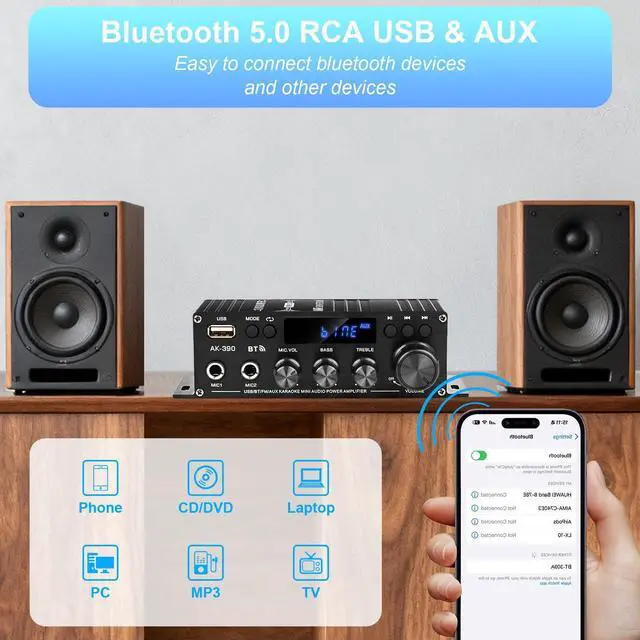 Bluetooth Amplifier 5.0 Built-in bluetooth 5.0 core, no pop, no audible noise when Bluetooth connection is established, designed for the customers who pursue HiFi sound.
