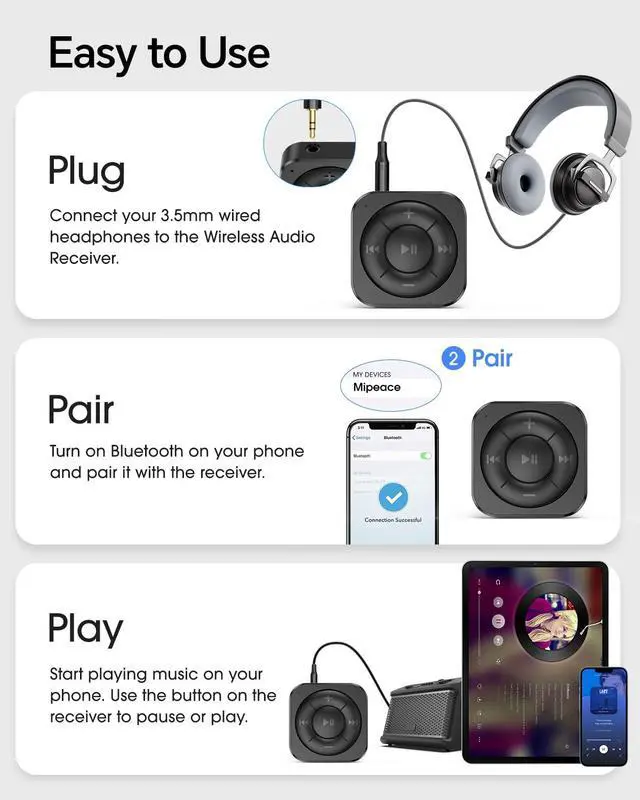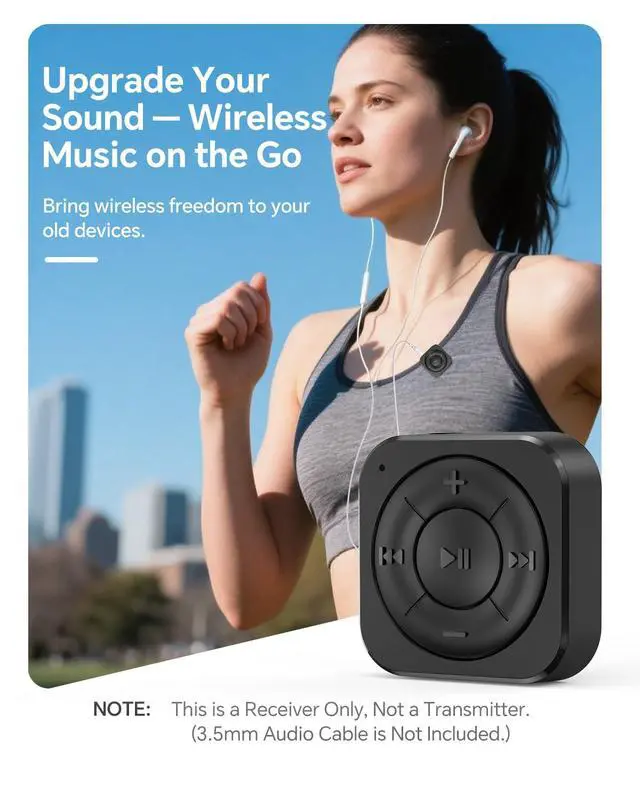 This Bluetooth audio receiver makes wired headphones, speakers, or AUX-enabled audio systems work wirelessly with phones or tablets. It is receiver only and does not transmit audio from TVs, PCs, or game consoles.