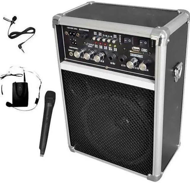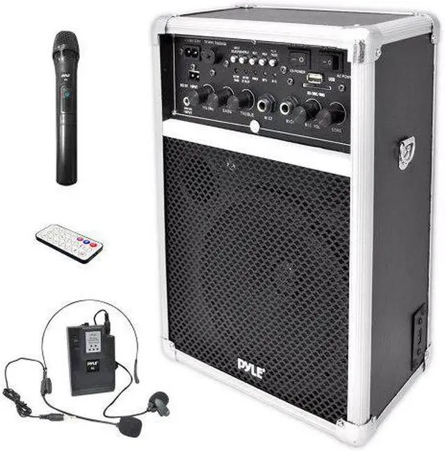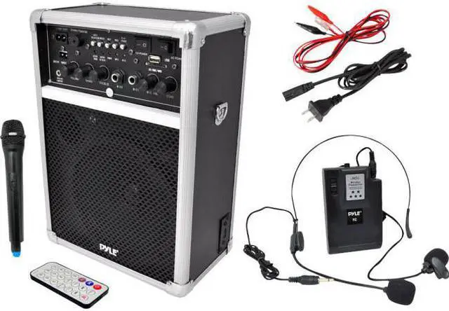 The PWMA170 is a portable PA from Pyle Pro that includes two wireless microphones, one handheld & one Lavalier microphone, to broadcast your voice to a large audience. Thanks to its 6' speaker and 400 watts peak, the full-range loudspeaker has enormous power and incredible sonic performance in a relatively light package. Don't want to go wireless? Plug in a wired mic, guitar, or other instrument using one of the two built-in ¼' input jacks. You can also use the PWMA170 to play MP3s from a USB stick or SD card, or connect an external MP3 player like an iPod or iPhone via the 3.5mm aux-in jack. Add effects to your voice and tweak your sound with the echo, bass, and treble controls. Perfect for classrooms, tour guides, and business meetings. Runs on 110 V AC or 12 V for car use.