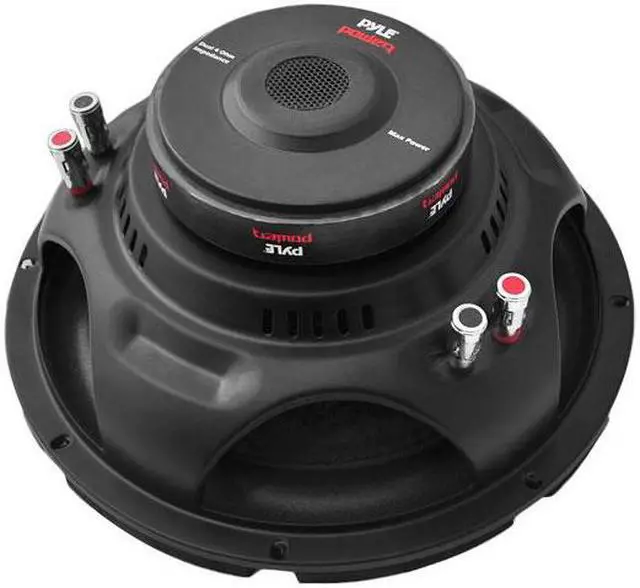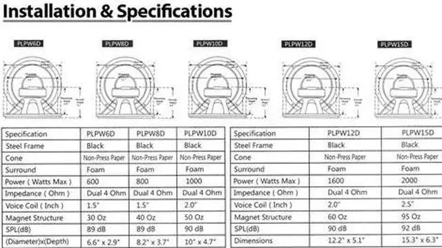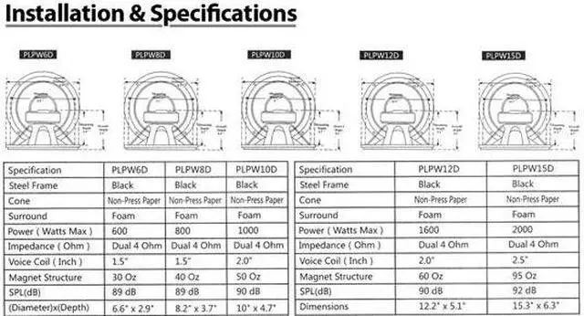 Black Steel Basket Non-Press Paper Cone Specially Treated Foam Surround 1.5'' 4 Layer Dual Voice Coil Dual 4 Ohm Impedance 30 OZ Magnet 300 Watts RMS / 600 Watts Max Power SPL: 89 dB Spring Loaded Push Down Speaker Terminals Dimensions: 6.6'' (Diameter) x 2.9'' (Depth) Sold as : Unit Pyle PLPW6D 6" 600 Watts Dual 4 Ohm Subwoofer Speaker