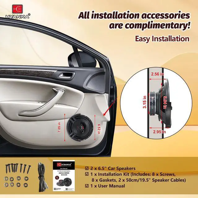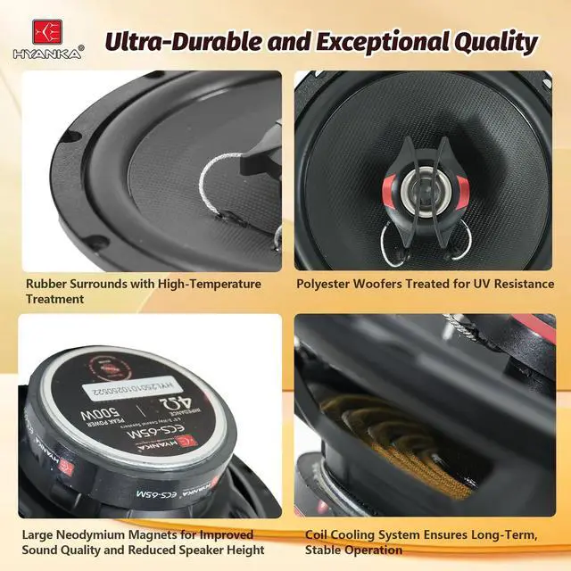 6.5-Inch Coaxial Car Door Speakers Audio, 6.5 inches, surface mount, The HYANKA 6.5 Door Speakers use standard speaker wire connections for transmitting and receiving audio signals., 500 watts, 20 KHz, 86 decibels
