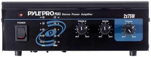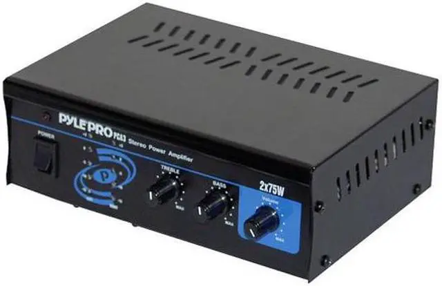 This mini stereo power amplifier provides up to 75 W of power on each channel at 4 ohms. Connect your inputs using the RCA jacks. Outputs over standard speaker push jacks. It's compatible with any audio or computer device - you can even hook up an iPod using a 3.5mm to RCA jack converter. Treble, bass, and volume controls on the front let you tweak your sound to exactly how you want it. Runs on 110 or 220 V.