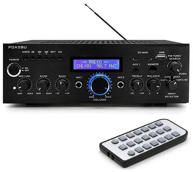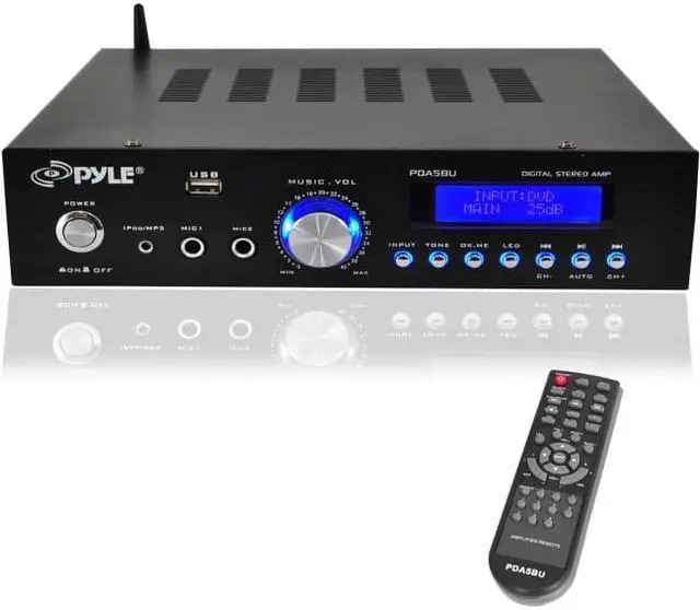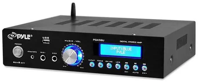 The Pyle Compact Stereo Amplifier Receiver System is the perfect solution for all of your home audio needs! Add powerful home theater style audio performance to your desktop that utilizes next generation surface-mount technology (SMT) -- designed to perform and deliver clear, accurate sound. It's loaded with plenty of sound playback features including Bluetooth wireless audio streaming, USB flash and SD memory card readers with MP3 digital audio file support, FM radio, along with an Aux (3.5mm) input jack to directly connect & stream audio from external devices. Connection interface includes dual 1/4'' inch microphone jacks, RCA (L/R) connectors, banana plugs and the USB input also doubles as a device charge port. Gain convenient audio control with the front panel control center while the digital LCD screen provides ID3 tag readout info for music track title display. Enjoyed versatile high-powered sound performance with the Pyle Mini Home Theater Amplifier Audio Receiver System.