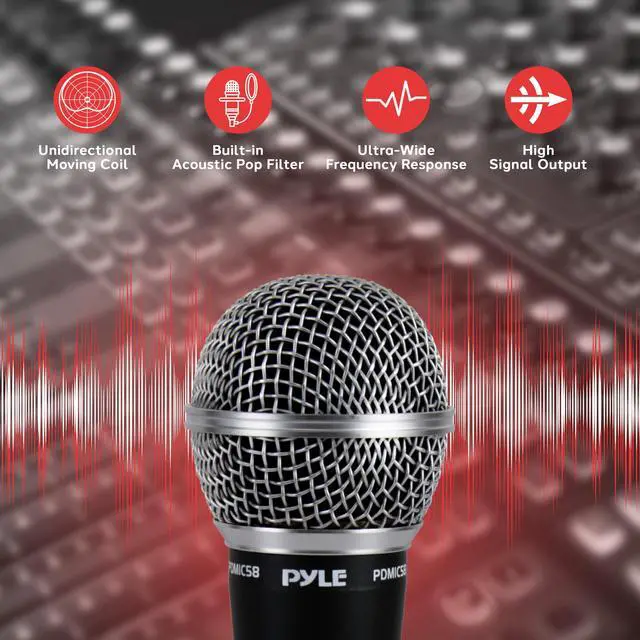 Elevate your audio setup with the Pyle Professional Dynamic Microphone 4-Pack, delivering exceptional sound clarity and versatility. Perfect for live performances or studio recordings, each microphone features a built-in acoustic pop filter to minimize distortion and enhance vocal quality. Whether singing, presenting, or recording, this set ensures professional-grade audio every time. Optimized for karaoke enthusiasts, this karaoke microphone set offers unidirectional sound capture that isolates vocals while reducing background noise. Crafted with rugged zinc alloy bodies and steel mesh grills, these dynamic microphones are built to endure regular use while maintaining top-notch performance. Each wired microphone comes with a 15-foot XLR to 1/4'' audio cable, providing flexibility and convenience for a seamless setup. Perfect for duets, multi-performer setups, or ensuring you always have a reliable backup, this 4-pack delivers dependable, high-quality audio performance. Designed for performers and professionals alike, this handheld microphone set is ideal for stage performances, studio recordings, and karaoke nights, offering the durability and sound quality you can count on.
