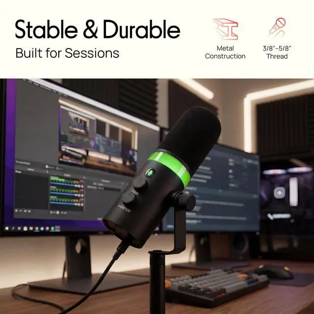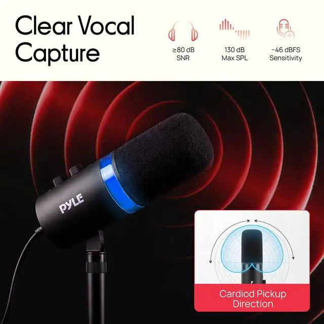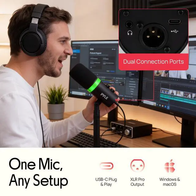 Upgrade your recording setup with the Pyle podcast microphone designed for creators who want clean, rich sound without complicated setup. This studio microphone features a dynamic capsule and cardioid pickup pattern to reduce background noise, helping your voice stay clear for podcasts, streaming, gaming, and voiceovers. With dual connectivity, it works as a usbc microphone for plug-and-play use on Windows, macOS, Android, and iPadOS, while also supporting XLR for a more advanced audio chain, making it a true xlr microphone for flexible workflows. Built for everyday creators, this podcast mic includes a desktop microphone with stand for stable placement, plus a foam windscreen to reduce plosives and harsh breath sounds. The built-in headphone monitoring jack provides real-time feedback, so you can record confidently without delay. If you use a headset with microphone for calls, this mic is a major step up in clarity and presence. From interviews to content creation, this streaming mic delivers reliable performance with easy on-mic controls, including gain adjustment, headphone volume, and mute. Its a complete microphone podcast solution for home studios and travel-ready setups.