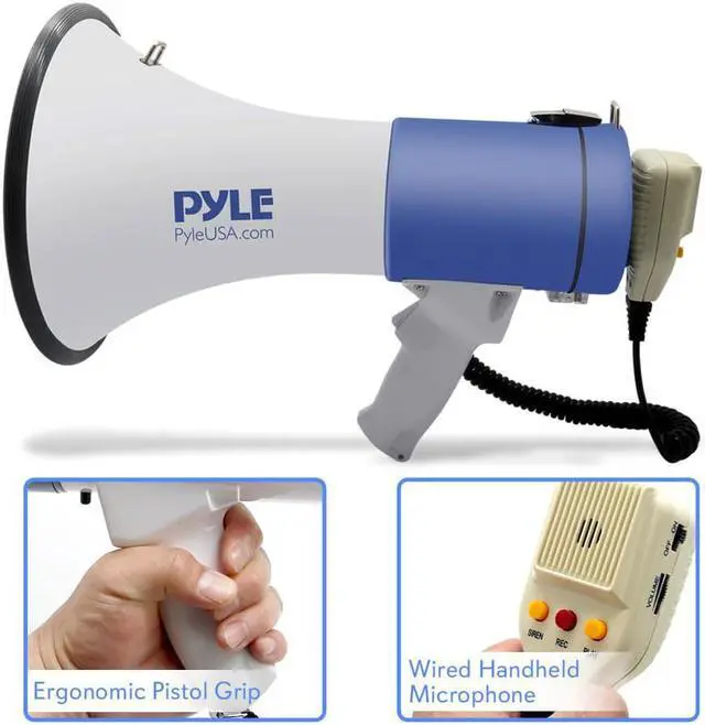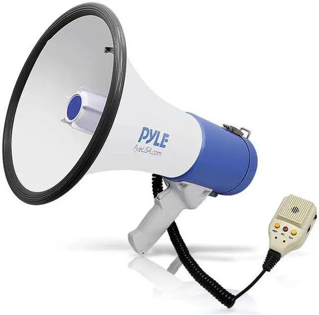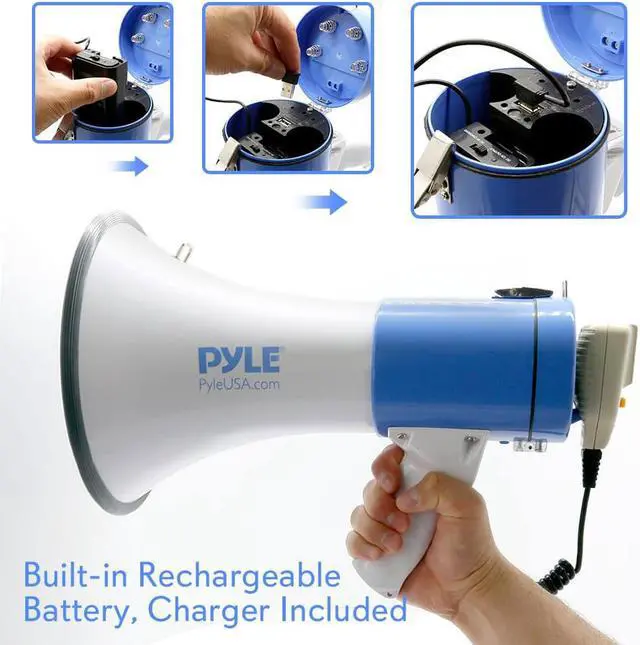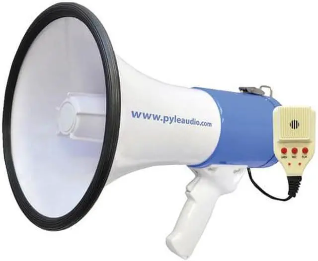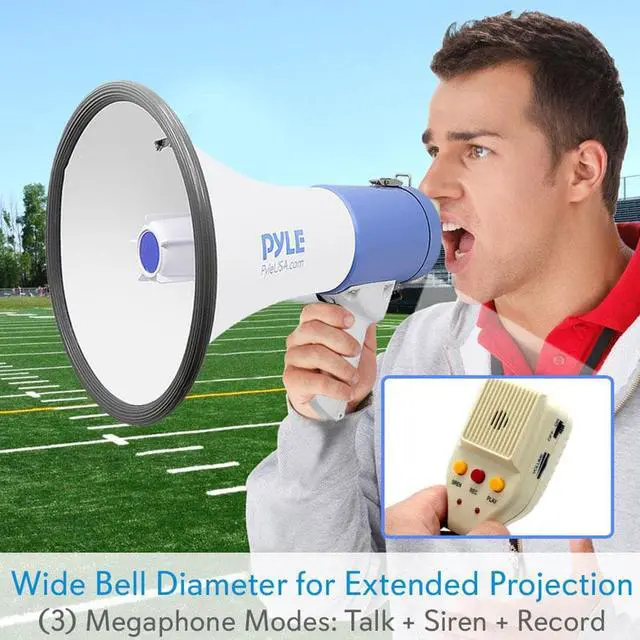 The PMP59IR is part of the latest megaphone offering from Pyle. With each iteration of flagship megaphones we've improved the battery life power and ergonomics. The included lithium battery provides long-lasting power and saves money on batteries. Plug in your MP3 player and broadcast your digital audio or music for everyone to hear. This model has 50 watts of power so your voice will be heard from 1200 yards away. The PMP59IR is equipped with a 10 second memory - perfect if you need to broadcast the same message repeatedly. And if you simply need to get everyone's attention switch to the siren mode to activate a loud powerful alarm sound.