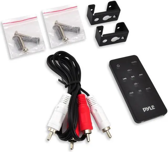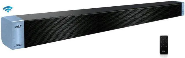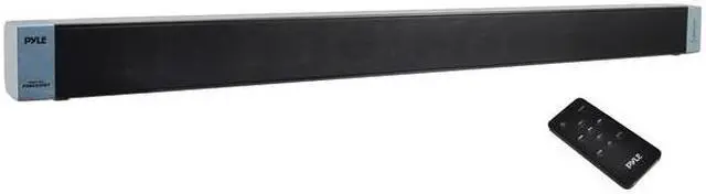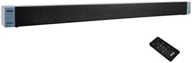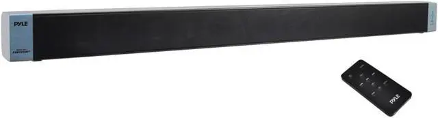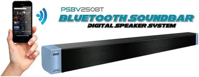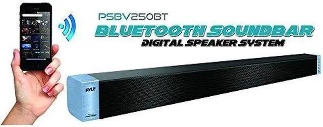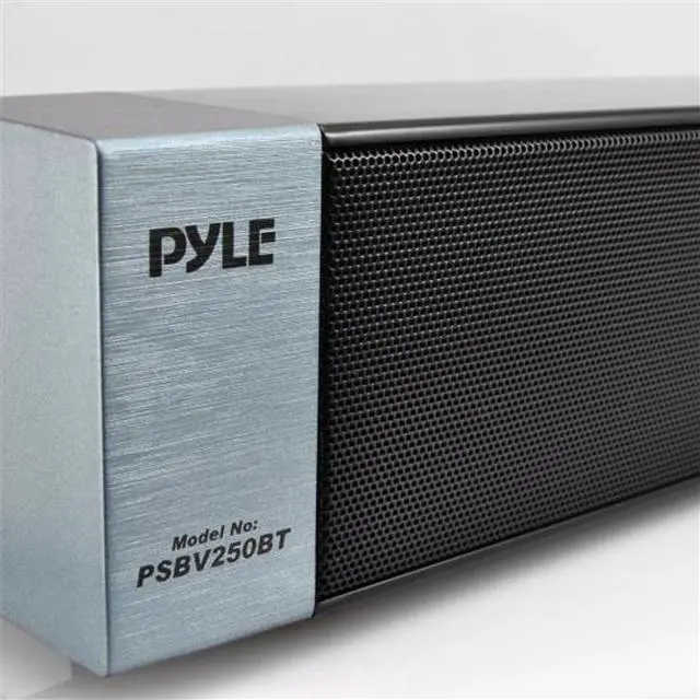 The Pyle Audio Level Bluetooth Stereo Sound Bar Speaker System is what your entertainment system has been missing. Built-in Bluetooth technology allows you to wirelessly stream audio from your favorite devices (works with virtually all Bluetooth-enabled devices likes iPhone, Android, Smartphone, iPad, Tablet, PC, etc.). Connect the 2-channel soundbar to your home theater system or computer thanks to the RCA Aux input. Add rich, full-bodied audio to any room in the house quickly and easily. It connects to your DVD player, cable box, TV or any other audio source -- connect it all! It works with additional external devices, like a Smartphone or MP3 Player, thanks to the AUX (3.5mm) input connector jack. The system also includes full function remote control so you can control it all from the couch. Let Pyle improve your home audio experience and add the PSBV250BT Bluetooth Sound Bar to your entertainment system.Powerful and Compact Speaker Sound Bar System Built-in Bluetooth for Instant Wireless Music Streaming Works with All of Your Favorite Bluetooth-Enabled Devices (iPhone, Smartphone, iPod, MP3 Player, iPad, Tablet, PC, MP3 player, etc.) Inputs: 3.5mm (AUX), RCA and Digital Optical Audio (Connect to TV, Mac, PC, Laptop, Home Theater, Receiver, etc.) Includes (2) 2'' Full Range Stereo Speakers 2-Channel Digital System Efficient Stereo Sound Reproduction Impressive Bass Response Easy Touch Button Controls Lightweight and Sleek Speaker Design Glossy Black Finish Equalizer (EQ) Preset Sound Effects Convenient Source Selection with LED Indicators Includes Wall Mount Brackets, Remote Control and RCA to RCA Audio CableTechnical Specs: Max Power Output: 20 Watt x 2 Bluetooth Version: 3.0 Bluetooth Wireless Range: 30 Feet Impedance: 8 Ohm Power Supply: AC~120V, 60Hz Frequency Response: 40Hz - 20kHz (+/-6dB) Input Sensitivity: 700mV S/N: 60dB THD: 10% Remote Battery Required: CR2025 Dimensions: 31.7'' x 2.3'' x 2.5'' Weight : 3.2 lbs.