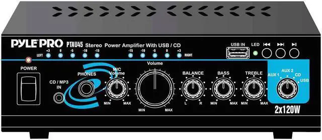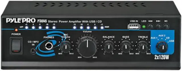 Pyle Audio PTAU45Brand NewIncludes 1 Year WarrantyProduct # PTAU45 PTAU45 Features: RMS Output Power: 120 W USB: Yes Number of Analog Audio Inputs: 3 Green Compliant: Yes Green Compliance Certificate/Authority: WEEE