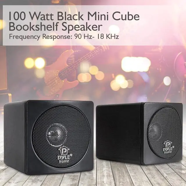 These black full range mini cube bookshelf speakers may look cute, but they pack a big punch. They're great for home theater systems or stereos, and they look sharp on tables or bookshelves. These speakers are powered by 3' paper cone drivers pushing 100 watts, delivering a frequency response of 90 Hz to 18 kHz. They're also video shielded to prevent damage to CRT monitors. When you're looking for power in a small package, look to these bookshelf speakers from Pyle Pro.