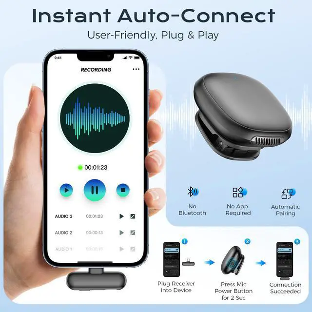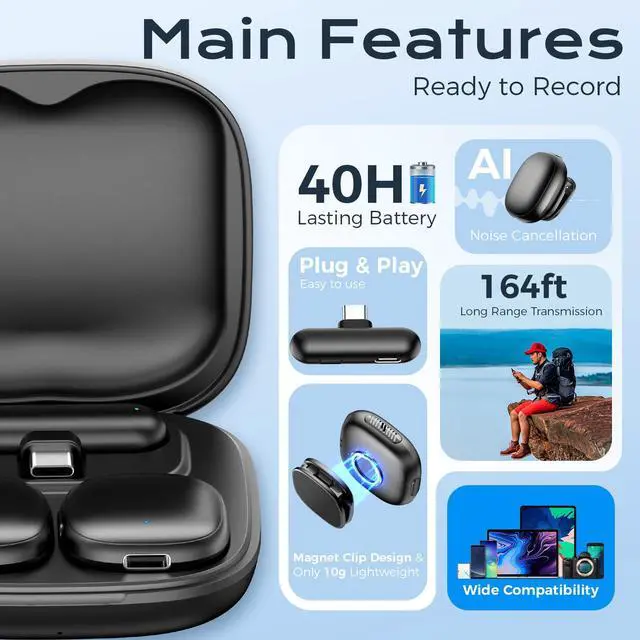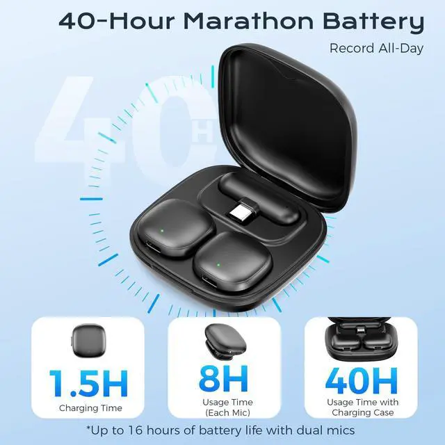 Elevate your audio game with our professional wireless lavalier microphone system. Designed for content creators, journalists, and filmmakers, this compact powerhouse delivers crystal-clear broadcast-quality sound without the hassle of wires. Featuring advanced noise reduction technology and a remarkable 164ft (50m) interference-free range, you'll capture every word with stunning claritywhether you're filming interviews, vlogs, or live streams. The ultra-lightweight clip-on design stays invisible on clothing while the magnetic charging case provides 35+ hours of total recording time. With plug-and-play USB-C compatibility for iPhone and Android, plus zero-latency monitoring, you're always ready to record professional-grade audio anywhere, anytime. Never let poor audio quality ruin another perfect shot again!