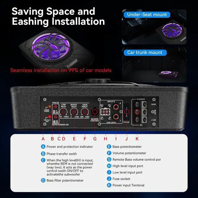 Under seat subwoofer can be easily installed under the seat or in the trunk, effectively upgrading your car's audio setup to provide a superior sound experience. Car subwoofer installation not only offers convenience but also efficiently saves interior space