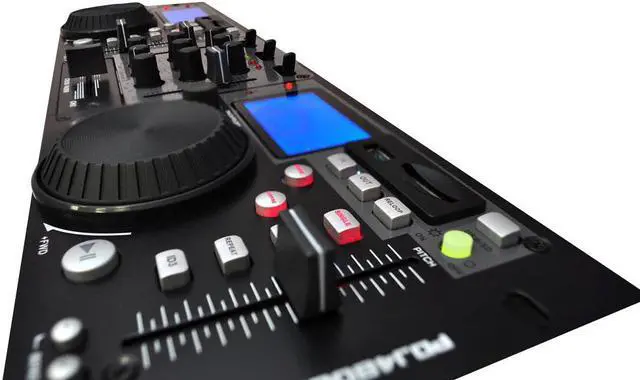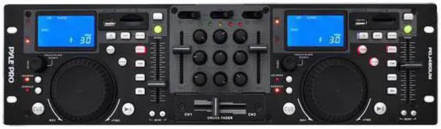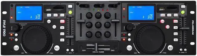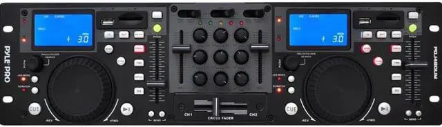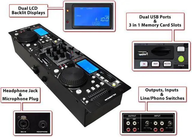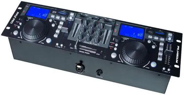 - Dual RCA Outputs - Rack-Mount Design - XLR Microphone Input - Continuous Loop Mode - USB and SD Card Player - 10+ Track-Folder Search - Dual Pitch Slide Control - Search-Single Time Button - Jog Wheel With Scratch Mode - LCD Display & Blue Backlight - Dual RCA Inputs (Phono & Line) - ID3 Tags for Track Information - 3-Band EQ on Multiple Channels - Pitch Bend Adjustment Range: 12% - Anti-Shock Buffer Memory: 40 Seconds - Dual Professional USB DJ MP3 & SD Card Player - Dimensions: 18.98'' W x 3.54'' D x 3.14'' H - Power Supply: 100-240 V, 60/50 Hz