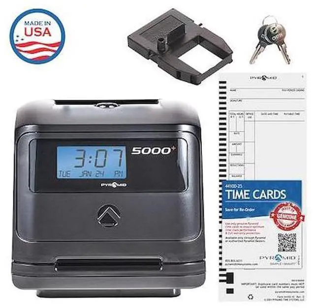 Digital, Card Swipe, Display Type LCD, Mount Surface, Wall, No. of Employees 50, Time Clock, Depth 6 1/2 in, Ribbon Color Black, Battery Backup Yes, Display LCD, Standards UL Listed Power Supply, Records Bi-Weekly, Semi-Monthly and Monthly Pay Periods, Weekly, Print Type Automatic, Includes 25 Time Cards, Ribbon, Time Clock, Two Security Keys, User Guide, Height 7 1/4 in, Width 7 in. This item has been restricted from sale in the following state (s): []