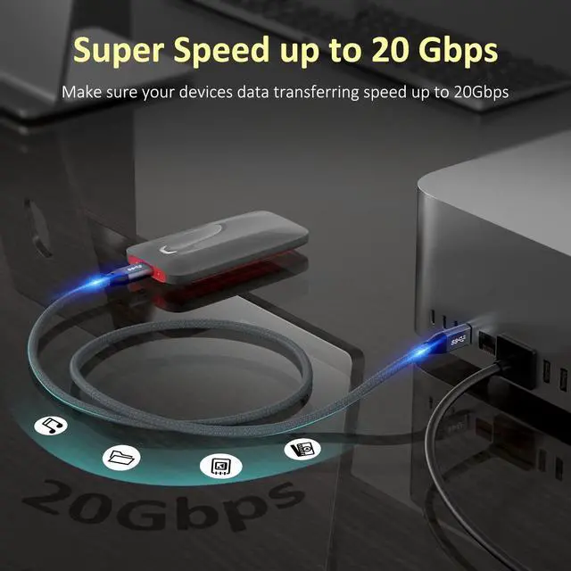 USB 3.2 cable fully complies with USB 3.2 Gen 2x2 standard, it offers up to 20Gbps SuperSpeed data transfer with Thunderbolt 3/4 External SSD Drive, just transfer large files in seconds. Note: the actual speed depend on your devices.