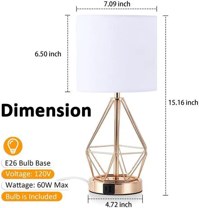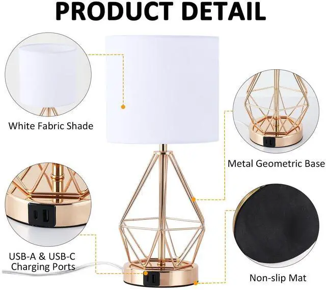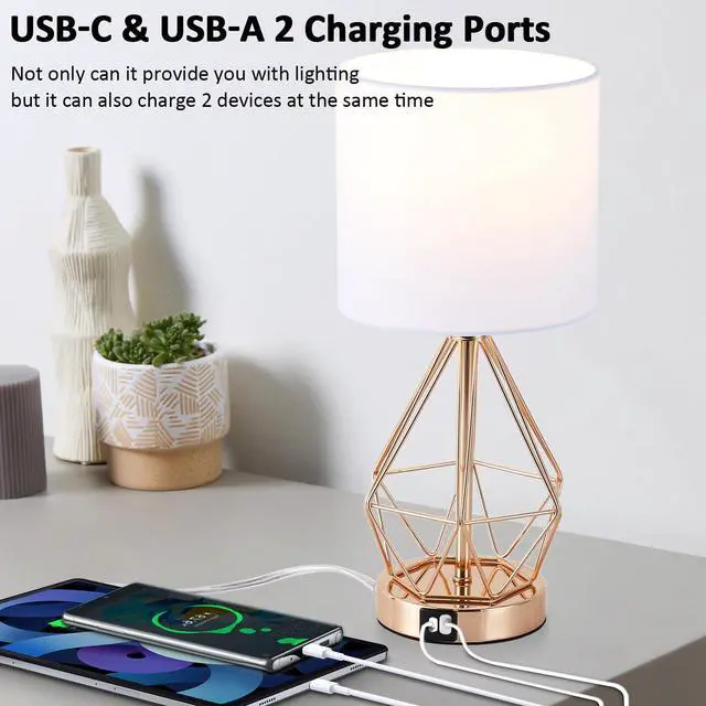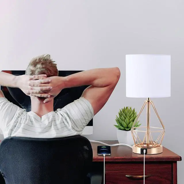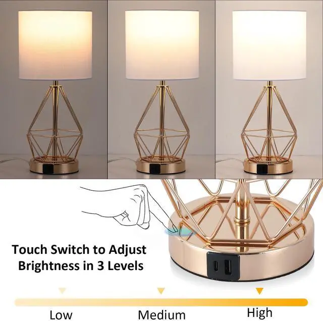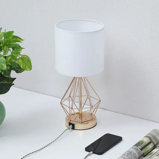 - Our Modern Touch Control Gold Table Lamp will exceed your expectations. Its sleek design with a geometric metal base and a white fabric shade adds a touch of modern elegance to your room. The touch control and dimmable feature make it convenient to set the right ambiance, while the added 2 USB charging ports are a practical functions. This dimmable bedside lamp with usb ports is not only stylish but also functional, making it a perfect addition to your bedroom and a useful desk lamp for your office.