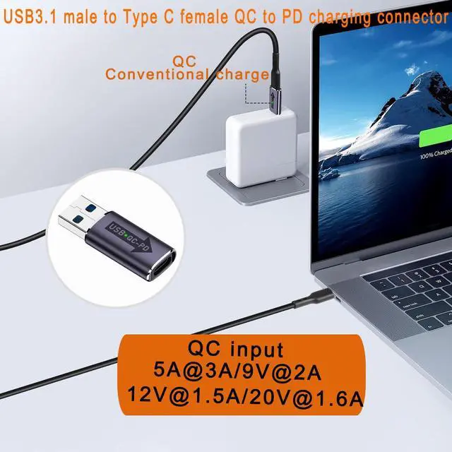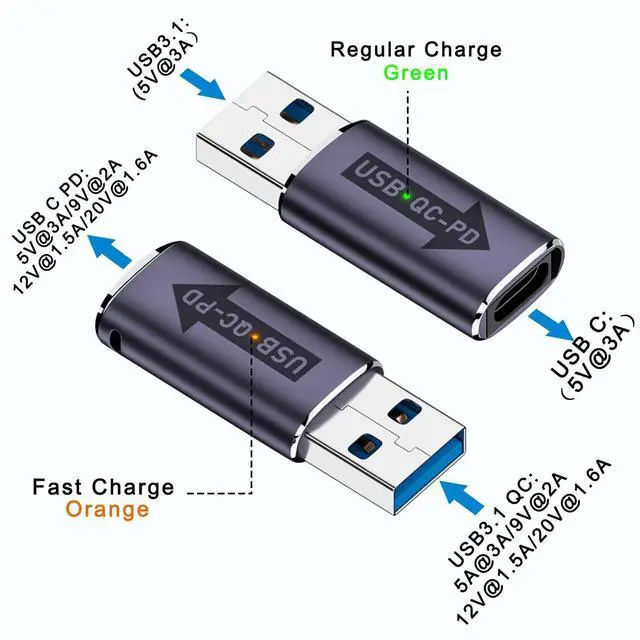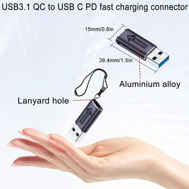USB3.1 Male to USB C Female Fast charging converter. Realise USB DC power to USB C PD in seconds for smooth transfer charging. With dual-colour LED work light, when regular charging, the LED light turns green. When fast charging, the LED light turns orange. Aluminium alloy case, durable and easy to dissipate heat. With hidden hanging hole, easy to carry, not easy to lose.
