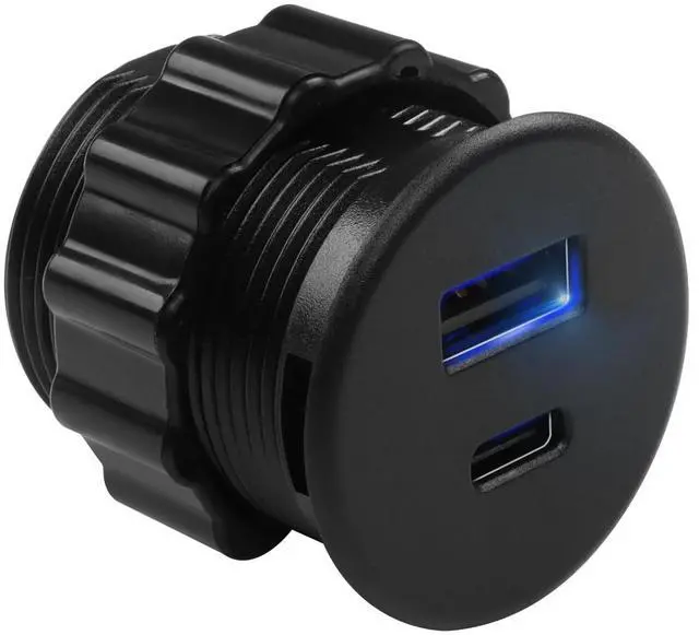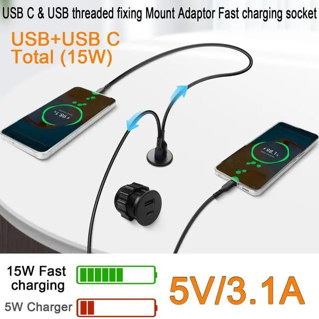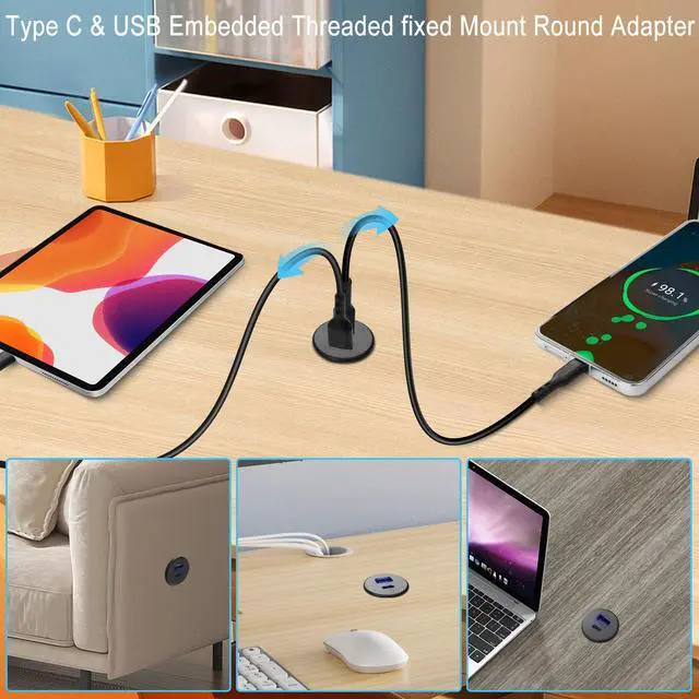 USB C & USB Threaded Fixing Flush Mount Desktop charging socket, USB C input, Type C & USB A 2-port output. Simply cut a 30mm hole in the surface of your desktop or furniture and install it by fixing it with a nut. Can charge 2 mobile phones/electronic devices at the same time. Suitable for installation on desk, office desk, conference table, furniture, sofa for fast charging mobile phones, tablets, digital electronic devices. It is made of flame retardant PC+ABS material, safe and durable. Built-in LED light, display when power on.