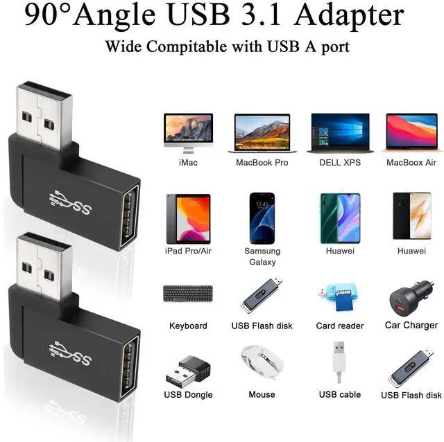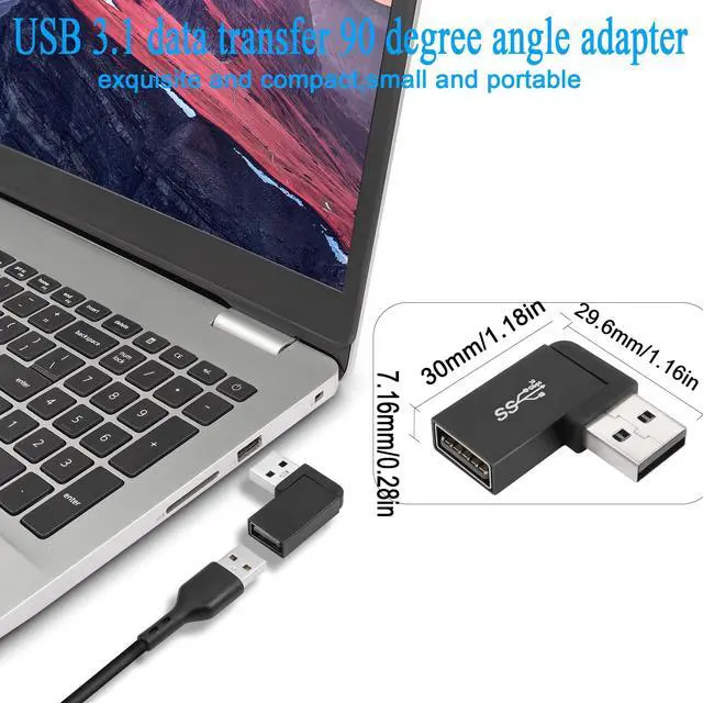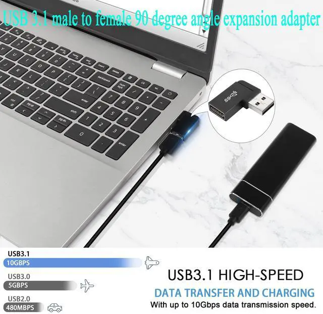 90 degree angle USB 3.1 male to female L-shaped connector adapter. Keeps the cable close to your PC, laptop and prevents damage caused by bending the cable, extending the life of the cable. Easily extends to protect the ports of your PC, laptop, tablet, mobile power or other USB devices. 10Gbps USB 3.1 male to female 90° angle adapter. Support OTG expansion function, let your tablet easily external auxiliary devices, such as joystick, mouse, keyboard, etc.