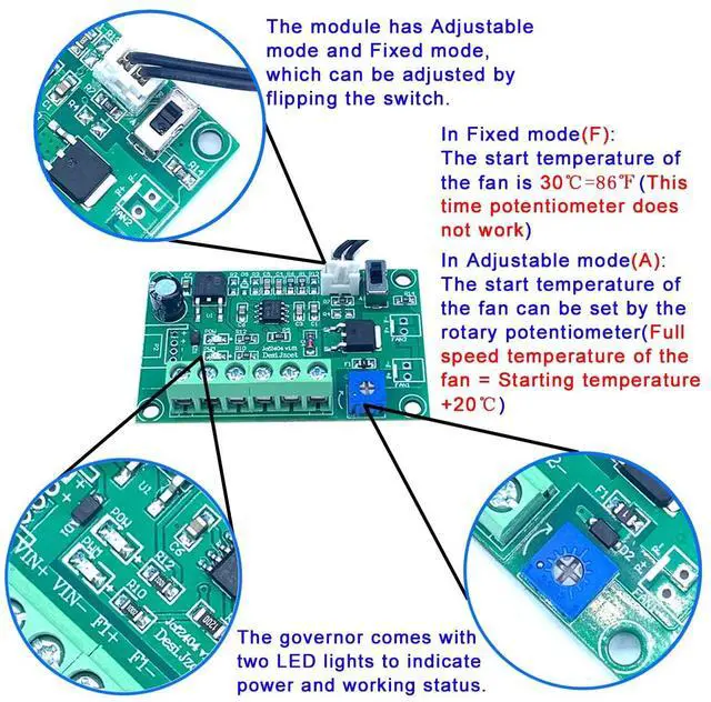 This speed governor uses PWM control technology to realize temperature control and speed regulation. The speed governor controls the fan speed according to the ambient temperature. The higher the temperature, the faster the speed. When the ambient temperature is lower than the set starting temperature, the governor controls the fan to stop running.