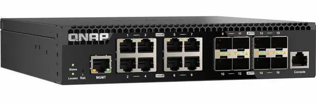 The QNAP QSW-M3216R-8S8T is a half-width rackmount L2 Managed Switch with eight 10GbE SFP+ fiber ports and eight 10GbE RJ45 ports. Supporting Layer 2 switching and network management via a user-friendly web user interface, the QSW-M3216R-8S8T offers flexible deployment in high-speed network environments and provides an entry-level network management solution.