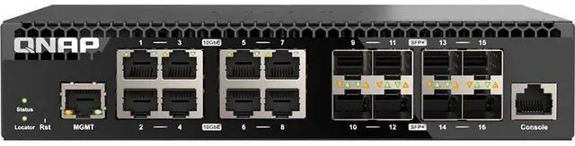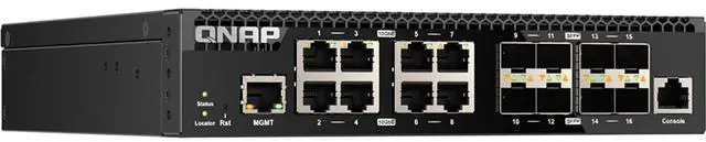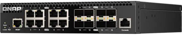 The QNAP QSW-M3216R-8S8T is a half-width rackmount L2 Managed Switch with eight 10GbE SFP+ fiber ports and eight 10GbE RJ45 ports. Supporting Layer 2 switching and network management via a user-friendly web user interface, the QSW-M3216R-8S8T offers flexible deployment in high-speed network environments and provides an entry-level network management solution.