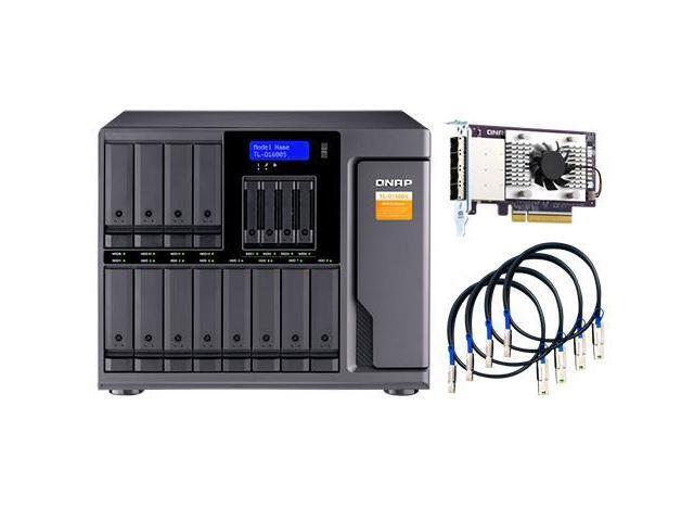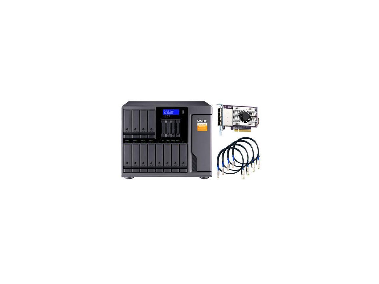 16-bay desktop SATA JBOD expansion unit with a QXP-1600eS PCIe SATA host card and 4 SFF-8088 to SFF-8644 SAS/SATA 6Gb/s external cables.