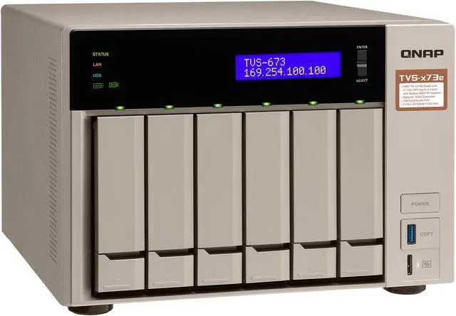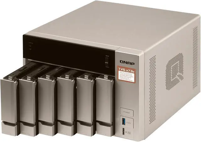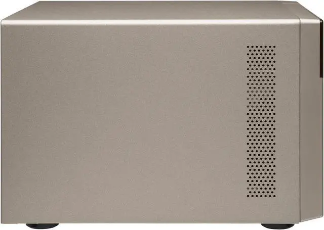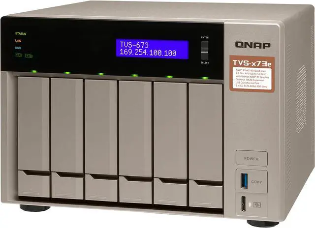 The TVS-673e is powered by a high-end AMD R-Series APU that incorporates an exceptional CPU with AMD Radeon™ R7 Graphics performance, delivering a high-performance and energy-efficient NAS solution. Built with a state-of-the-art metal design and topped off with a stylish gold finish, the highly-capable TVS-673e provides PCIe expandability, the unique USB QuickAccess port, HDMI 4K@ 30Hz output, and 4K H.264 video decoding and encoding acceleration for an optimum audiovisual experience.