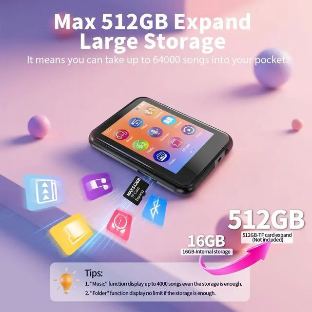 Music player built-in 64GB & Full touch screenBuilt-in 64GB large memory and support up to 512GB TF card. (TF card not Included)NO WORRY ABOUT MEMORY. More songs could be saved in your pocket,It's not just your music player but also a removable disk on which to store your files.