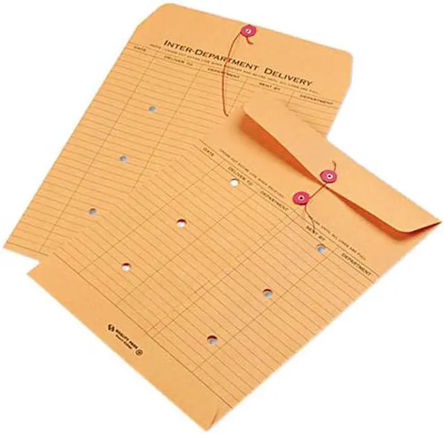 Envelopes offer a ruled format for interdepartmental routing. Holes allow visual acknowledgment of contents. Interdepartmental envelope design features a string-and-button closure and standard style with five columns: Date, Deliver To, Department, Sent By and Department. Envelopes are printed on both sides with space for 52 entries and made with 28 lb. recycled Kraft stock.