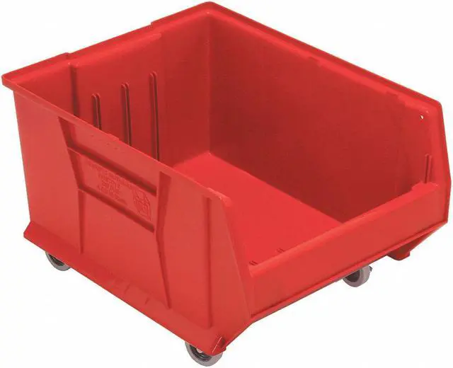 Mobile Hopper Bin, Outside Length 23 7/8 in, Outside Width 18 1/4 in, Outside Height 12 in, Inside Length 21 1/2 in, Inside Width 16 in, Inside Height 11 3/4 in, Volume Capacity 2.4 cu ft, Load Capacity 250 lb, Material Polypropylene, Color Red, Caster Size 3 in, Caster Type (4) Swivel with Brakes, Use with Grainger Divider No. 11M596, Divider Color Black, No. of Divider Slots Long 3, Standards FDA Approved, ESD Conductive No. This item has been restricted from sale in the following state (s): []