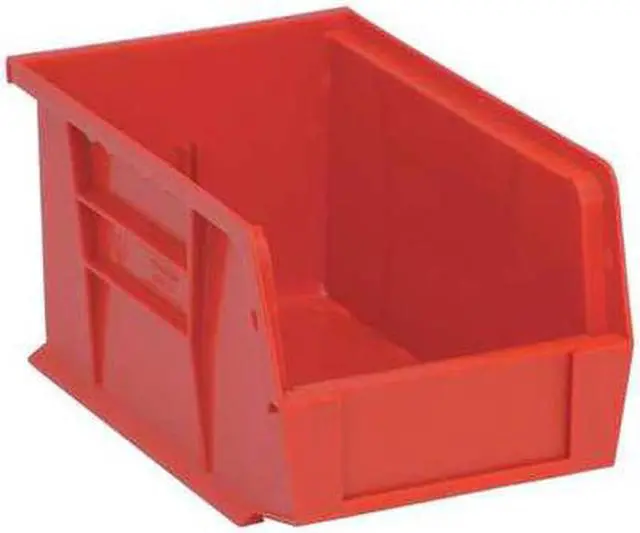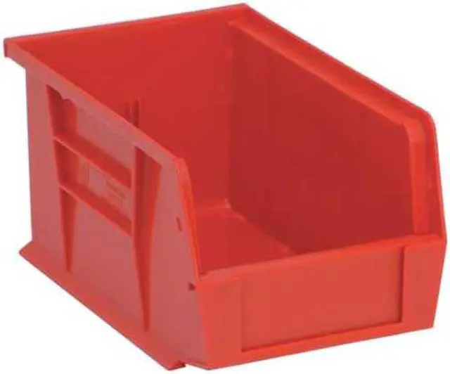Hang and Stack Bin, Outside Length 9 1/4 in, Outside Width 6 in, Outside Height 5 in, Inside Length 8 1/2 in, Inside Width 5 1/8 in, Inside Height 4 1/2 in, Volume Capacity 0.12 cu ft, Load Capacity 50 lb, Material Polypropylene, Color Red, Use Divider No. Mfr. No. DUS221, No. of Divider Slots Long 1, No. of Divider Slots Short 0, ESD Conductive No