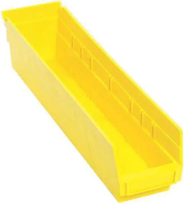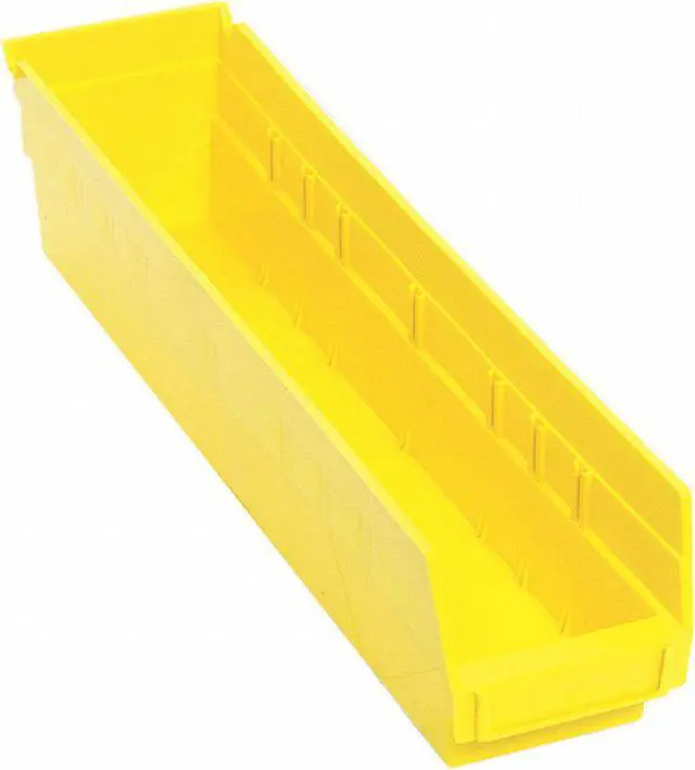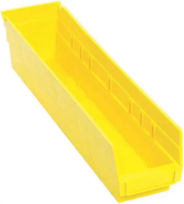 Shelf Bin, Outside Length 17 7/8 in, Outside Width 4 1/8 in, Outside Height 4 in, Inside Length 16 1/2 in, Inside Width 3 in, Inside Height 4 in, Volume Capacity 0.11 cu ft, Load Capacity 50 lb, Material Polypropylene, Color Yellow, Use Divider No. Mfr. No. DSB101/103/105, No. of Divider Slots Long 0, No. of Divider Slots Short 7, ESD Conductive No