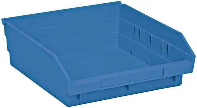 Shelf Bin, Outside Length 11 5/8 in, Outside Width 11 1/8 in, Outside Height 4 in, Inside Length 10 1/4 in, Inside Width 10 in, Inside Height 4 in, Volume Capacity 0.23 cu ft, Load Capacity 50 lb, Material Polypropylene, Color Blue, Use Divider No. Mfr. No. DSB109/110/116, No. of Divider Slots Long 0, No. of Divider Slots Short 7, ESD Conductive No