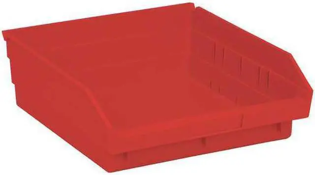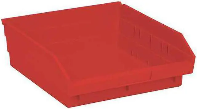 Shelf Bin, Outside Length 11 5/8 in, Outside Width 11 1/8 in, Outside Height 4 in, Inside Length 10 1/4 in, Inside Width 10 in, Inside Height 4 in, Volume Capacity 0.23 cu ft, Load Capacity 50 lb, Material Polypropylene, Color Red, Use Divider No. Mfr. No. DSB109/110/116, No. of Divider Slots Long 0, No. of Divider Slots Short 7, ESD Conductive No