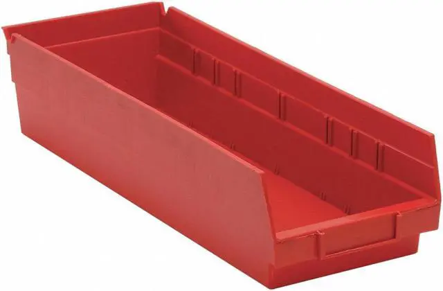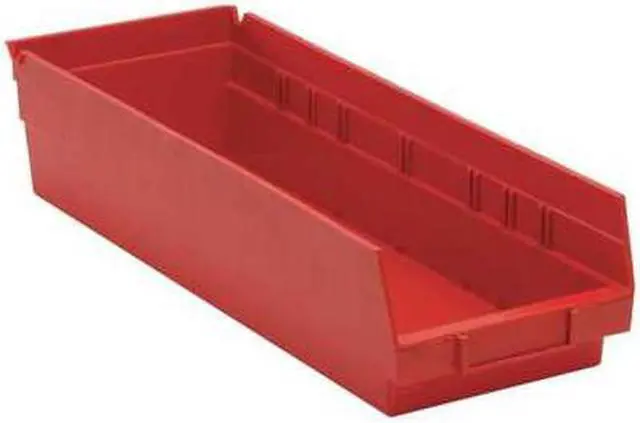 Shelf Bin, Outside Length 17 7/8 in, Outside Width 6 5/8 in, Outside Height 4 in, Inside Length 16 1/2 in, Inside Width 5 1/2 in, Inside Height 4 in, Volume Capacity 0.21 cu ft, Load Capacity 50 lb, Material Polypropylene, Color Red, Use Divider No. Mfr. No. DSB102/104/106, No. of Divider Slots Long 0, No. of Divider Slots Short 7, ESD Conductive No