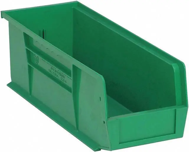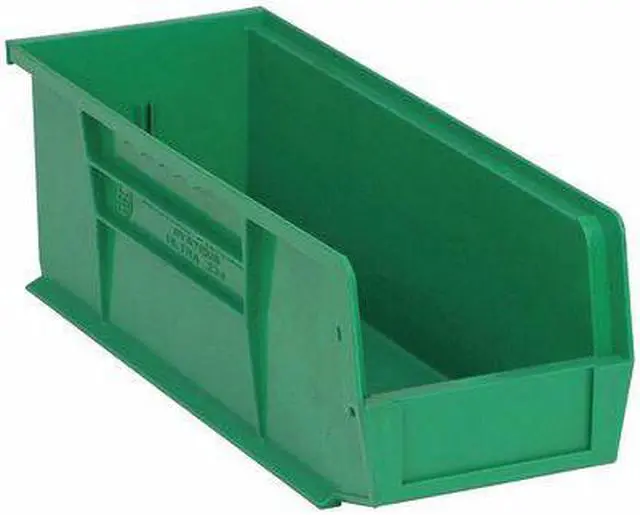 Hang and Stack Bin, Outside Length 14 3/4 in, Outside Width 5 1/2 in, Outside Height 5 in, Inside Length 14 1/16 in, Inside Width 4 3/8 in, Inside Height 4 3/4 in, Volume Capacity 0.23 cu ft, Load Capacity 50 lb, Material Polypropylene, Color Green, Use Divider No. Mfr. No. DUS234, Use with Grainger Divider No. 8PCC3, No. of Divider Slots Long 1, No. of Divider Slots Short 0, ESD Conductive No