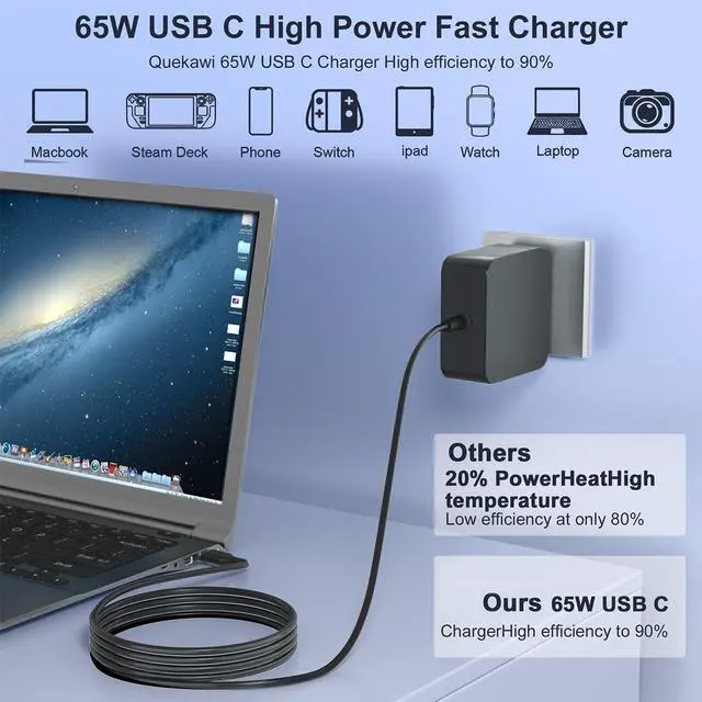65W USB-C PD Fast Charger is widely compatible with USB-C port Laptop device fast charging, stable fast charging will not damage the battery.