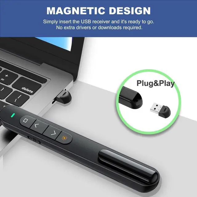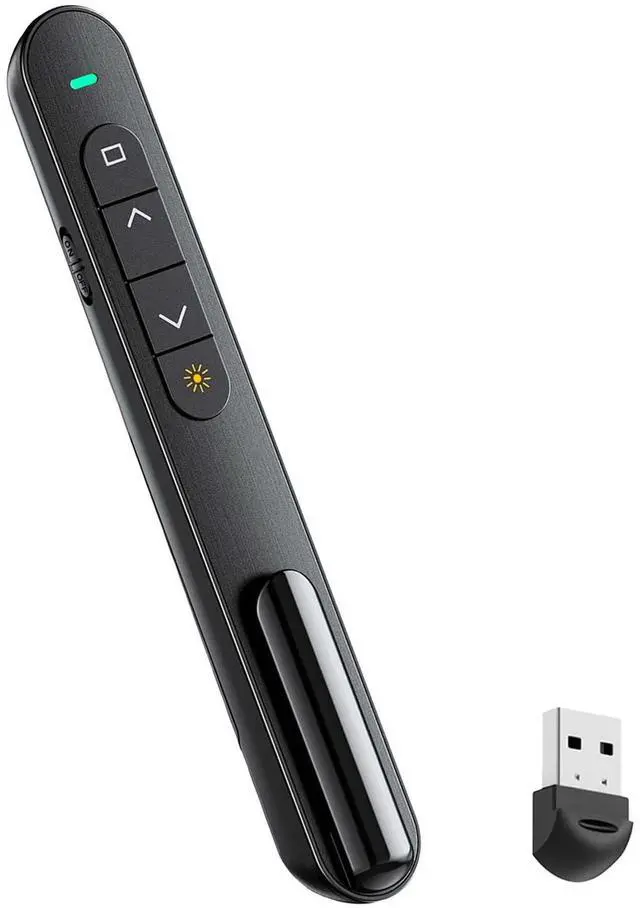 Enhance your presentations with this wireless presentation clicker! Designed for convenient control over your slides, this presentation remote is suitable for teachers, business professionals, and speakers alike. Its lightweight and portable design allows you to navigate through your slides with a simple click This presentation clicker includes a built-in red light to help you highlight key points. Equipped with a USB-C receiver, it offers broad compatibility with various computers and laptops, making it a practical tool for frequent presenters This presentation pointer boasts an extended wireless range (up to 328 feet), allowing you to move around the room while keeping your audience engaged. Its ergonomic design fits comfortably in your hand, even during long sessions It's the useful slideshow clicker for those who value performance. Whether you're leading a board meeting, teaching a class, or delivering a major speech, this clicker Keep you in control