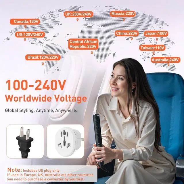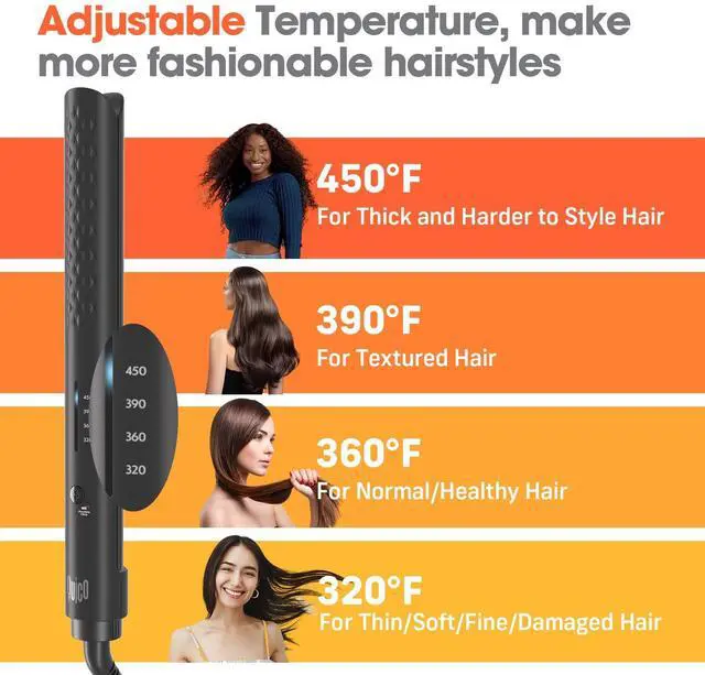 | Product Benefits | Negative Ion technology for anti-frizz; 15-second fast heating; temperature memory; adjustable from 320 to 450; wide voltage range 110V 240V; auto shut-off |
