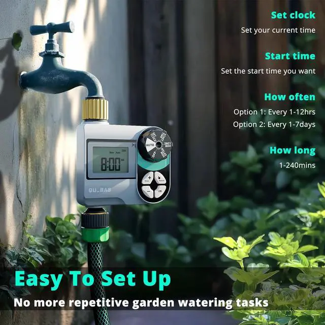 [EASY-TO-USE & PROGRAMMABLE] Take control of your garden's watering schedule with ease. Simply set the "Set CLOCK," "START TIME," "HOW LONG" and HOW OFTEN to automate your sprinklers. Choose watering durations from 1 minute to 240 minutes and frequencies from every 1-12 hours or 1-7 days for a fully customized irrigation plan.