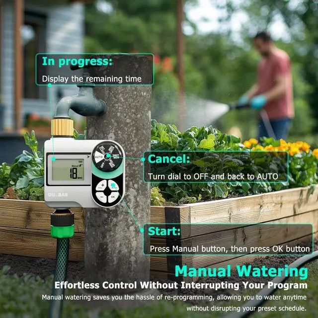 [FLEXIBLE OPERATION MODES] Switch between Automatic, Manual, and Rain Delay modes to suit your needs. In Auto Mode, your preset schedule runs seamlessly. Use Manual Mode for on-demand watering, or activate Rain Delay to pause watering for 24, 48, or 72 hours when the soil is already moist.
