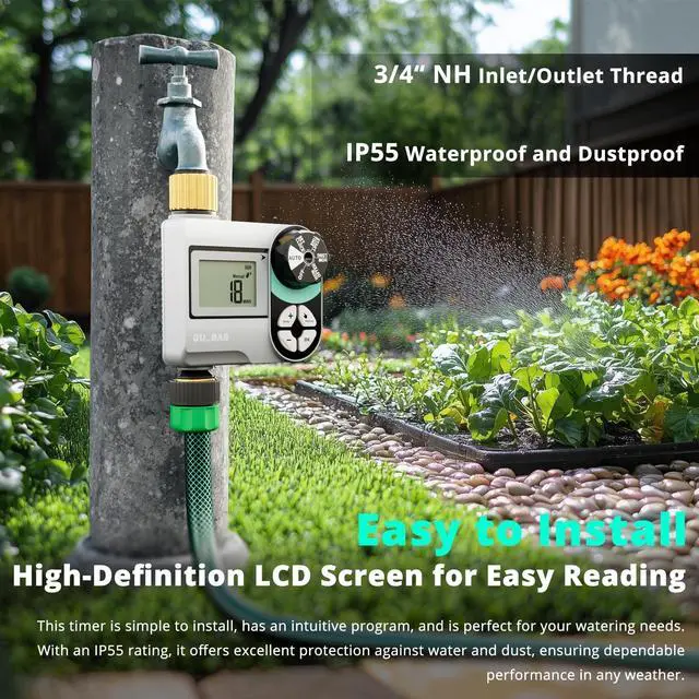 [CLEAR LARGE LCD SCREEN] Featuring a large, easy-to-read LCD display, this soaker hose timer is designed for hassle-free programming. Its IP55 waterproof rating makes it perfect for outdoor use in gardens, lawns, and yards. With efficient power consumption, the battery can last over a year, even with frequent use.