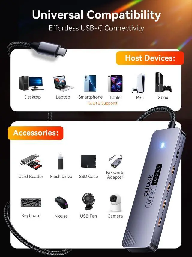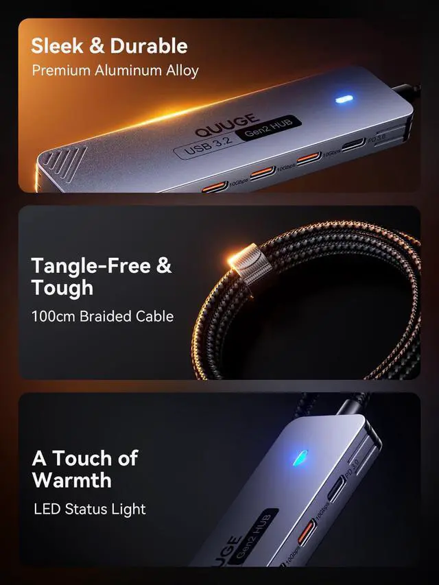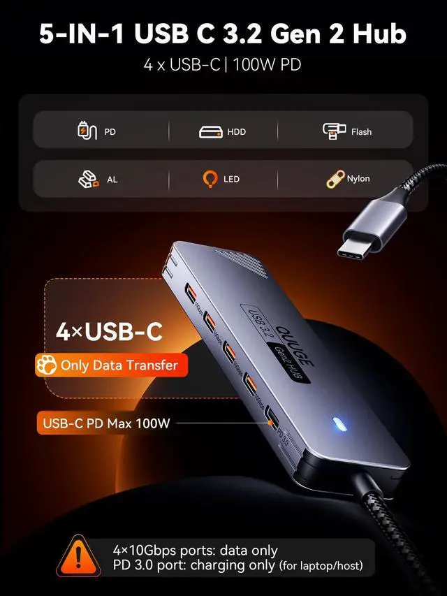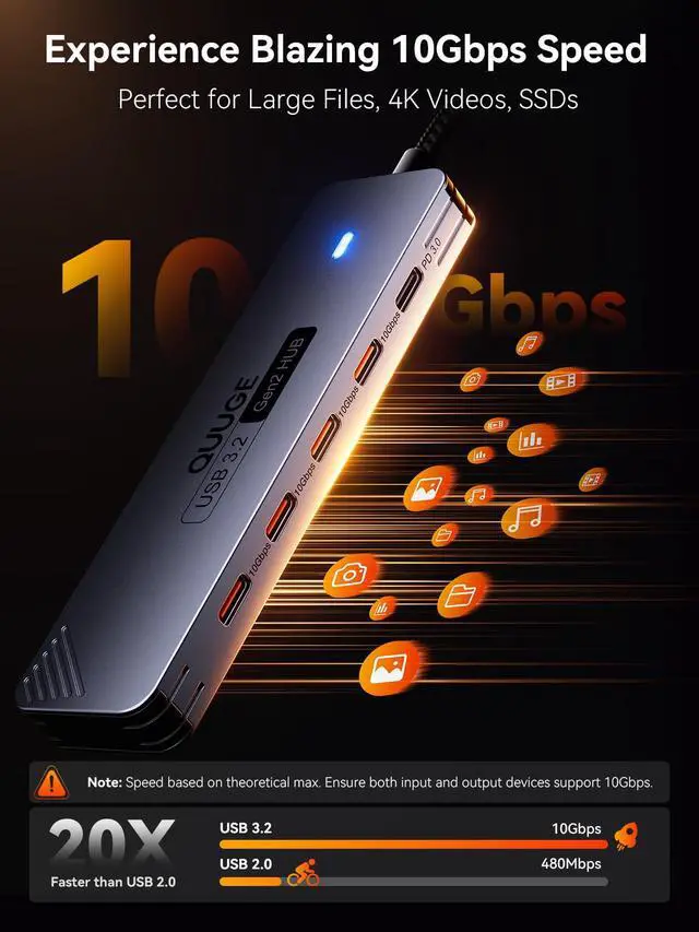 USB-C 3.2 Gen 2 Hub: Achieve lightning-fast 10Gbps speeds (USB 3.2 Gen 2) across all 4 ports transfer a 4K movie in 15 seconds or backup 100GB of photos in 90 seconds. Perfect for external SSDs, photographers, and video editors.