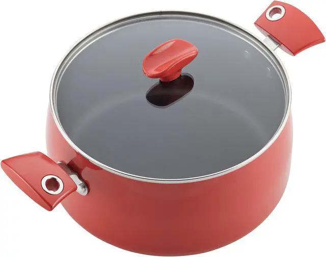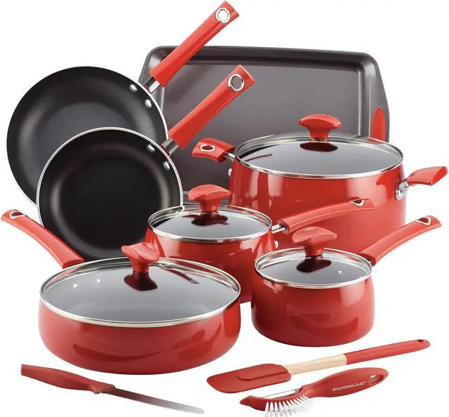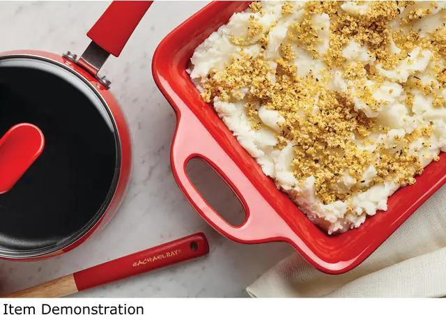 | Special Features | Cozy up in the kitchen to the comfortable, colorful performance and style of the Rachael Ray Porcelain Enamel Cookware 14-Piece Set, including a nonstick baking sheet and nonstick-suitable nylon turner. Inspired by Rachael's time in Copenhagen and her love of hygge: a look of coziness, enjoying the good things in life, a state of mind, this 14-piece set includes a variety of essential pots and pans so home cooks are prepped to handle meal after meal. The cookware features sturdy aluminum construction which heats up quickly and evenly and holds up to years of everyday comfort cooking. The cookware interiors are coated in long-lasting nonstick for beautiful release even when foods are chewy and gooey. And of course Rach makes cookware designed to clean up just as easily. Best of all, the colorful porcelain enamel exterior coordinates with the sturdy handles for a splash of modern style. Add just the right accent of modern ease to the kitchen with Rachael Ray cookware. This set includes all the essentials for making a whole range of recipes. There’s a utility knife, two sauce pans, a cookie sheet for roasting, toasting and baking, a saute pan, two skillets, a nonstick suitable spatula, and a Veg-a-Peel. Cook Rach’s delish recipes for yummy brunches, lunches, or dinners, and keep your food prep just as comfortable as your entertaining. Shatter-resistant glass lids make it easy to monitor cooking progress without losing heat or moisture. The set is oven safe to 350 degrees F, and comes with a Lifetime Limited Warranty. Comfort foods and comfortable cooking is in hand and in style with the durable, colorful Rachael Ray Porcelain Enamel Cookware 14-Piece Set inspired by Copenhagen coziness. |