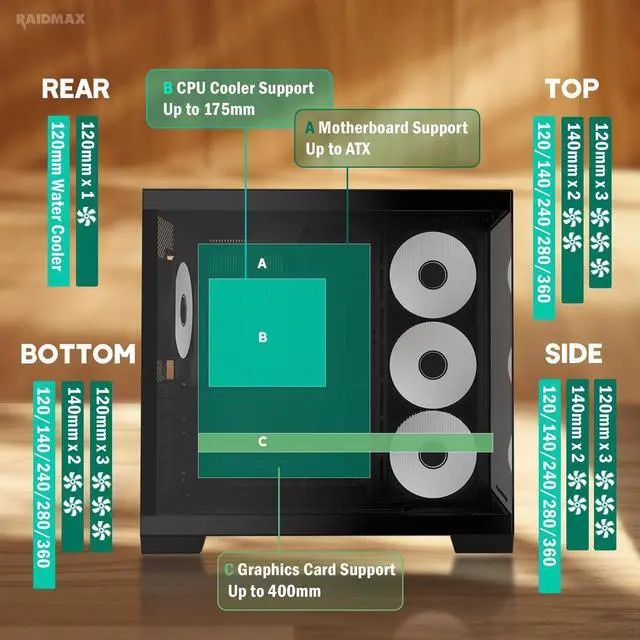 Spacious and Compatible: Supports GPUs up to 400mm in length, accommodating high-performance hardware with ease.