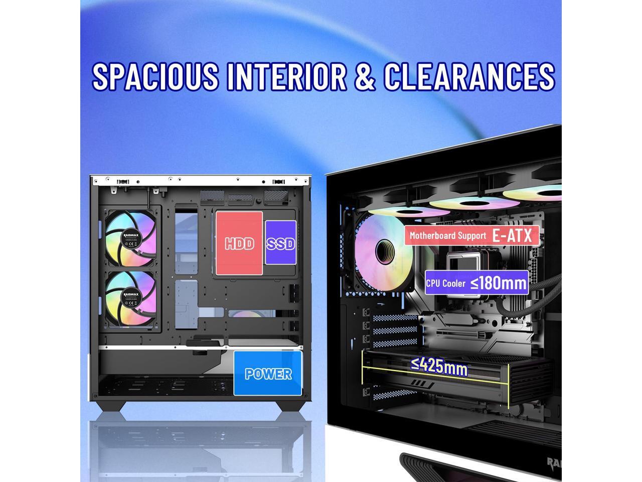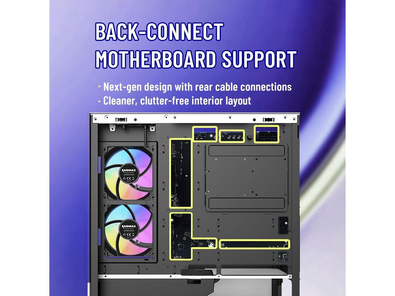 - E-ATX, ATX & Back-Connect Motherboard Ready Wide internal clearance supports large-format motherboards and unconventional layouts.