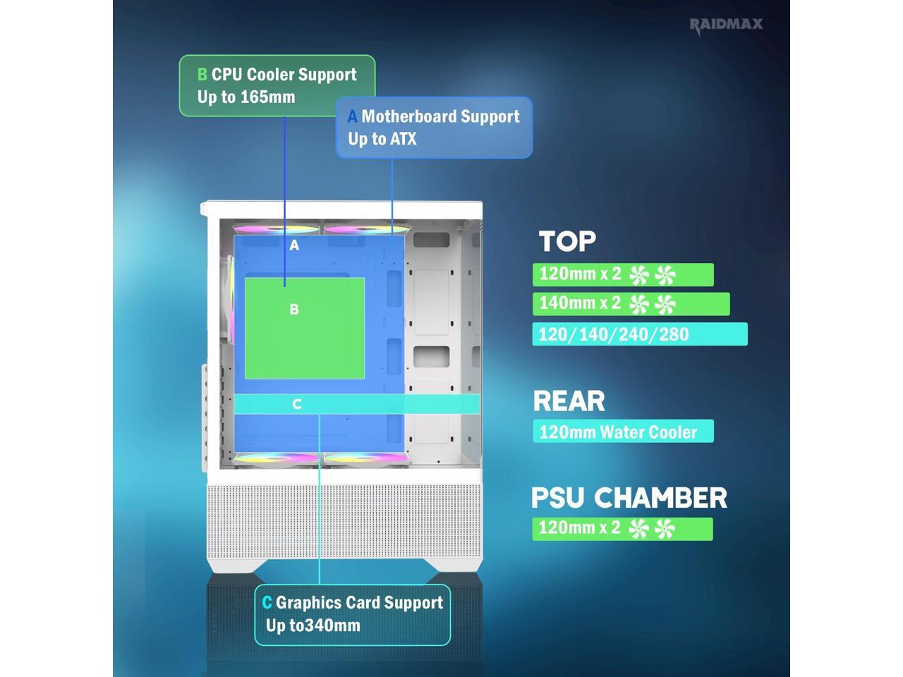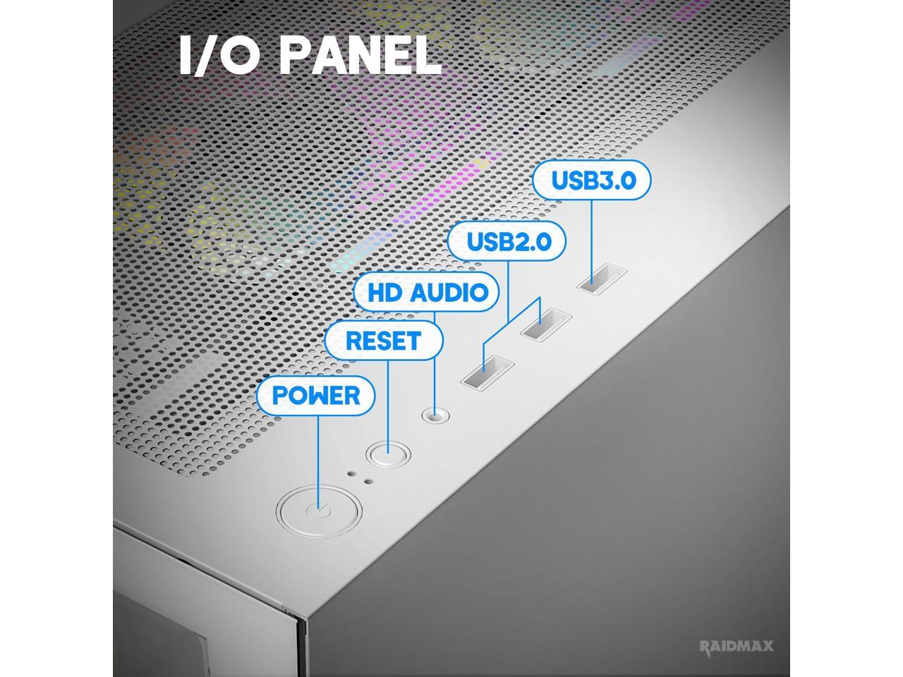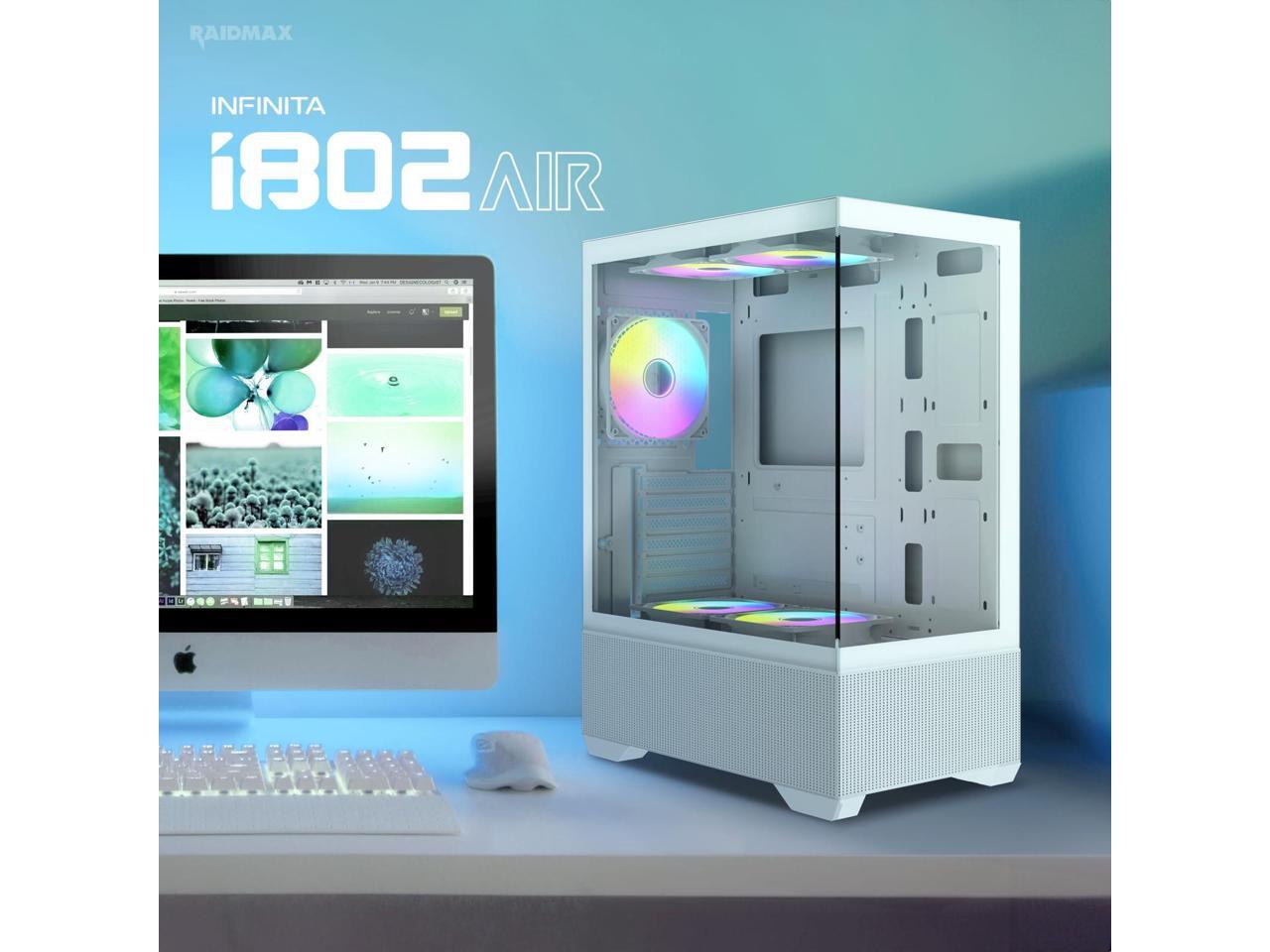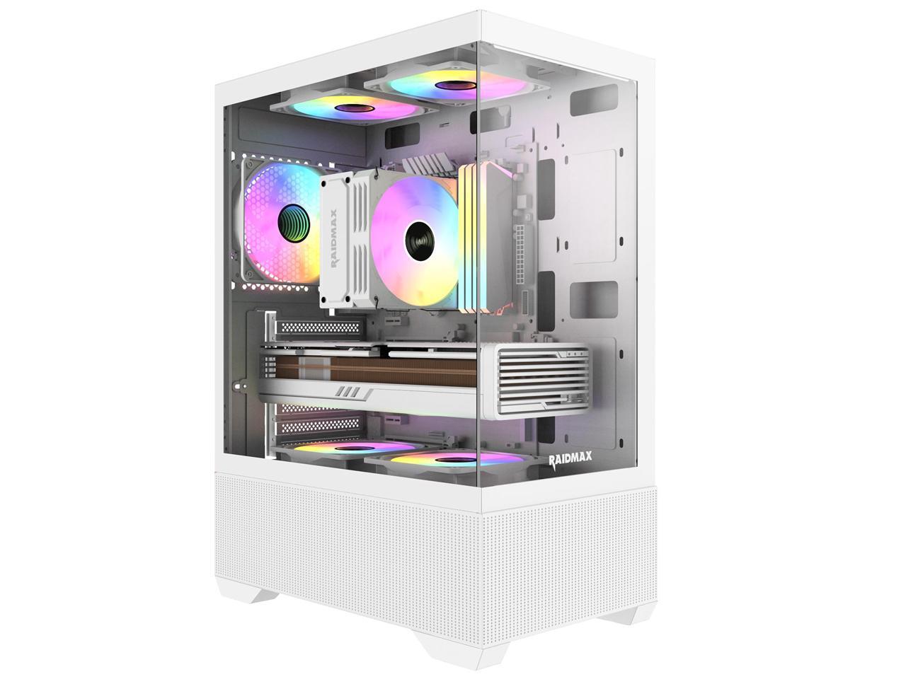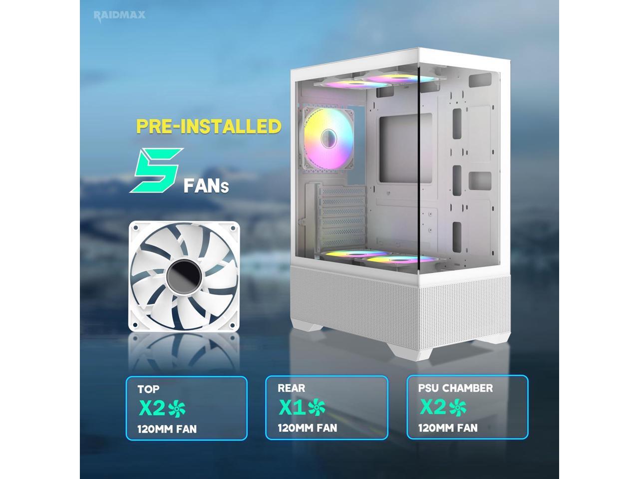 Raidmax I802 AWS White Color Air Flow Compact Panoramic ATX Mid Tower Case 270° View Tempered Glass, 5x Pre-Installed 120mm Static RGB Color Fans, Supports ATX/Micro ATX Motherboards, Max 340mm GPU