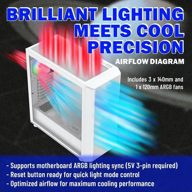 • *Pre-Installed ARGB Fans: Comes with 3x 140mm and 1x 120mm ARGB fans for vibrant lighting effects and superior airflow.