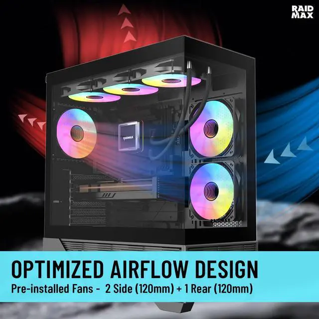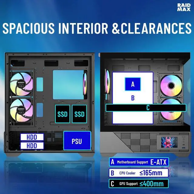 Step into the next level of PC building with the RAIDMAX i803, a premium panoramic ATX mid tower chassis crafted for builders who demand performance, style, and smart features. With dual 4mm tempered glass panels, the i803 delivers a stunning 270° showcase view of your hardware and lighting. At the front, a customizable LCD display panel lets you monitor system stats or display images, logos, or system info for an interactive, futuristic experience. Pre-installed ARGB fans provide synchronized lighting effects, while the spacious interior supports up to 400mm GPUs, 360mm radiators, and next-gen components with ease. Whether you're building a high-end gaming rig or a streaming-ready workstation, the i803 combines aesthetics and utility like no other.