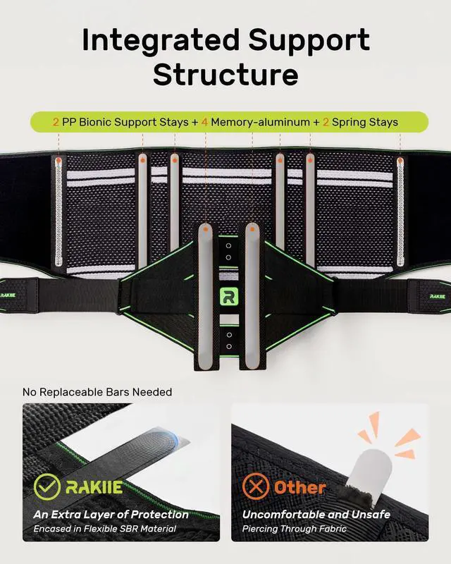 • 8X Effective Back SupportRakiie back brace for men and women features an ergonomic support system (2 bionic lumbar stays + 4 memory aluminum supports + 2 elastic springs) that provides comprehensive 8X support to the back, delivering solid lower back support, and limiting unnecessary back movement. For optimal comfort, we recommend wearing the brace over clothing.